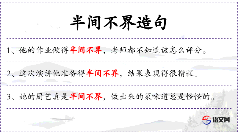 - 半间不界:这个成语源自**传统文化,用来形容做事不彻底、不认真。