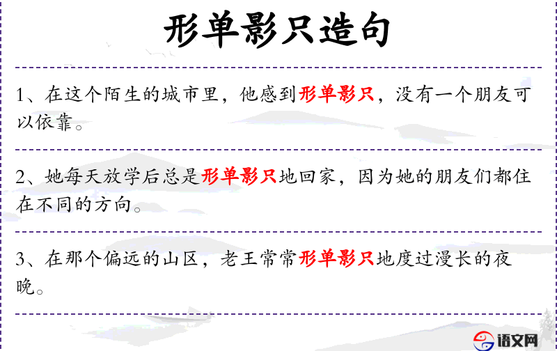 3. 【形单影只】 形:身体;只:单独。只有自己的身体和自己的影子。形容孤独,没有同伴。
