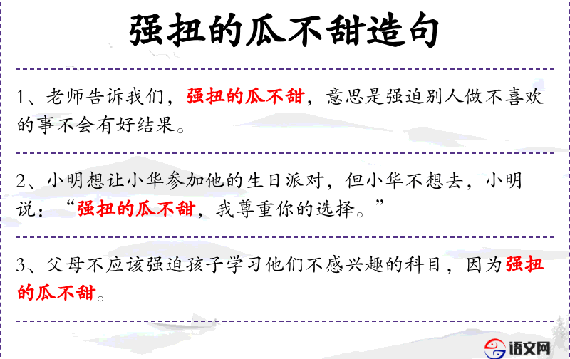 句子中的“强扭的瓜不甜”是一个成语,反映了人对于事物自然发展和社会关系的看法。在**文化中,强调“顺其自然”和“和谐”,这个成语正是这种文化价值观的体现。