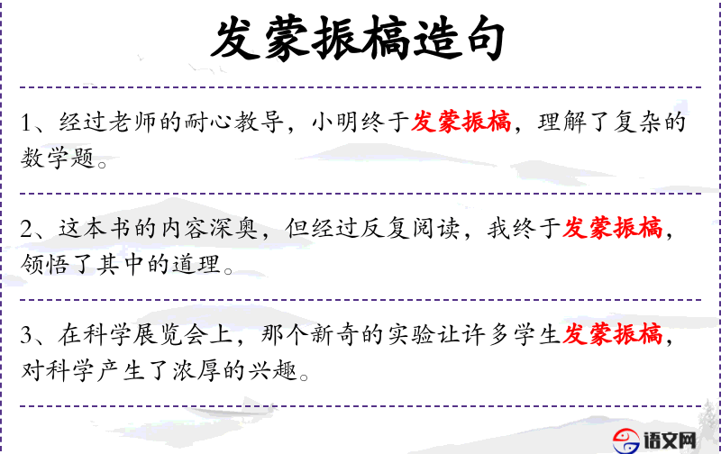 - 发蒙振槁:这是一个成语,形容人突然明白或振作起来。