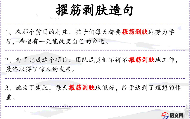 - 擢筋剥肤:形容非常刻苦努力,字面意思是拔筋剥皮,比喻极端的辛苦和努力。