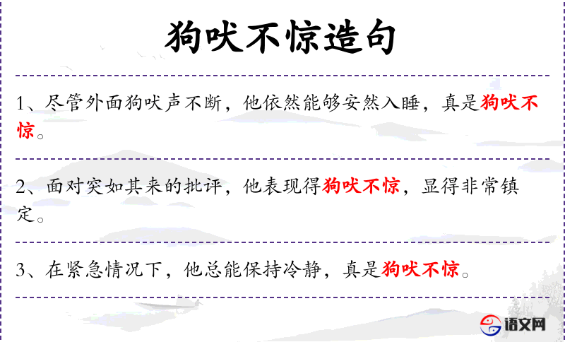 6. 【狗吠不惊】 吠:狗叫声。狗偶尔的叫声不会引起惊慌。形容社会太平安定。