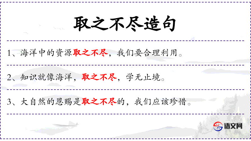 1. 【取之不尽】 拿不尽。形容极其丰富。