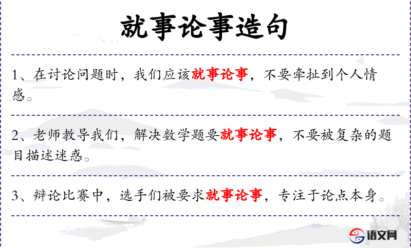 - 就事论事:指根据事情本身来讨论,不涉及个人情感。