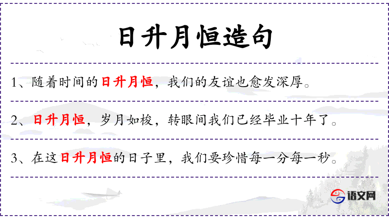 - 日升月恒:在**文化中,日升月恒常用来比喻事物的恒常变化,如自然界的规律。