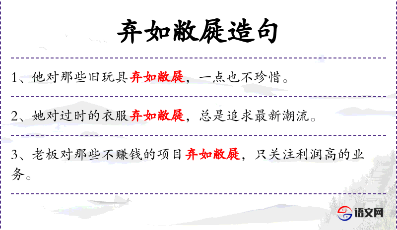 - 使用“弃如敝屣”这样的表达可能带有一定的夸张和强调效果,用以突出主语的态度。