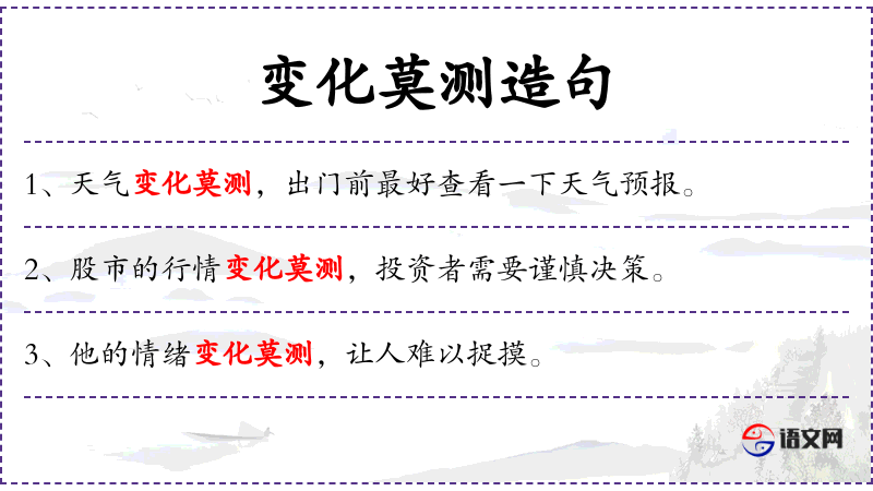 1. 【变化莫测】 测:估测。变化很多,不能预料。