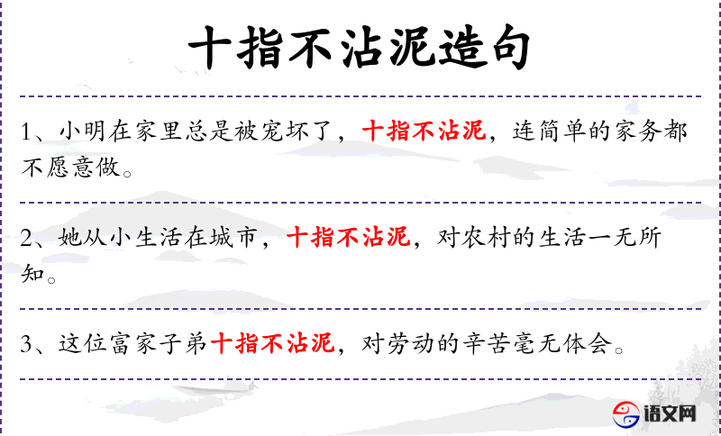 - 十指不沾泥:成语,形容人非常干净或不从事体力劳动。