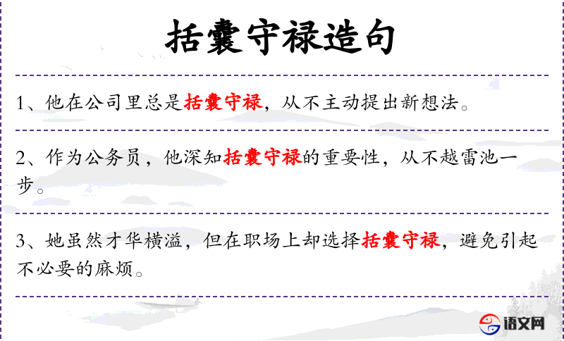 - 宾语:在职场中括囊守禄是一种智慧,可以避免很多冲突