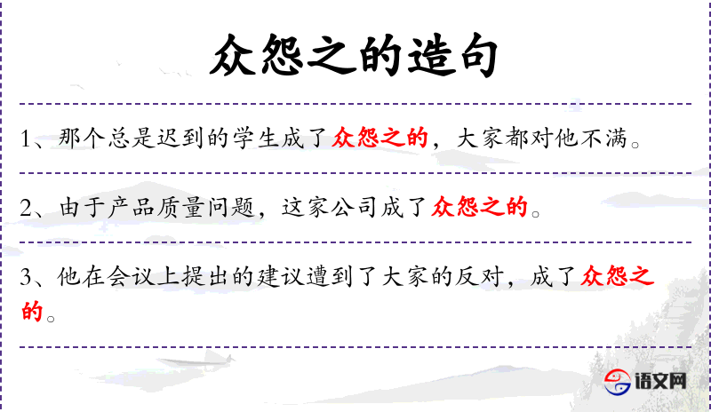 - 在英文中,“target of everyone's complaints”更直接地表达了“众怨之的”的含义,强调了集体对个体行为的负面反应。