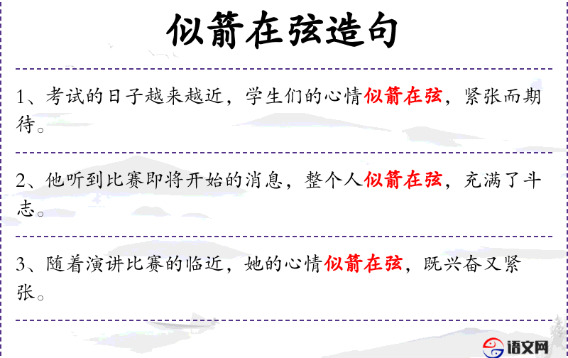 - “随着演讲比赛的逼近,她感到既兴奋又紧张,心情如同箭在弦上。”