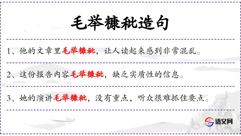 4. 【毛举糠秕】 毛举:琐碎列举。糠秕:谷类废弃不可食的部分。比喻不厌其烦地列举琐碎的事或没有价值的事物。