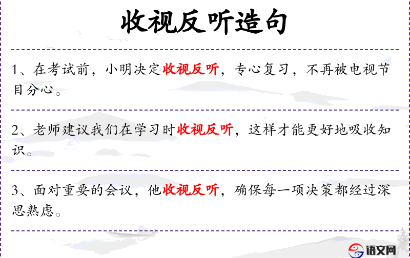 - 成语:“收视反听”是一个成语,强调在特定情况下需要集中注意力,不听外界干扰。