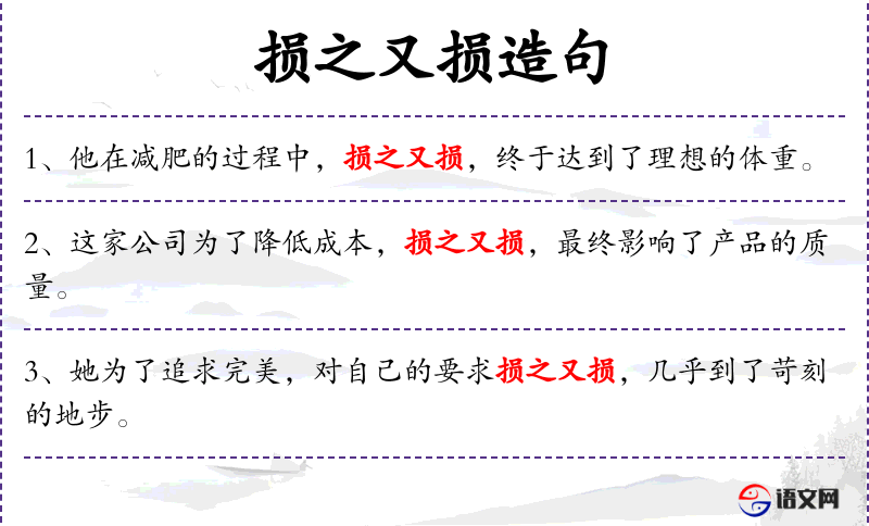 - 损之又损:表示不断遭受损失,可以替换为“一再受损”、“屡遭损失”等。