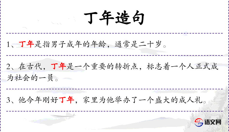 1. 【丁年】 - 男子成丁之年。历代之制不一『以男子二十岁为丁,明清以十六岁为丁。亦泛指壮年。