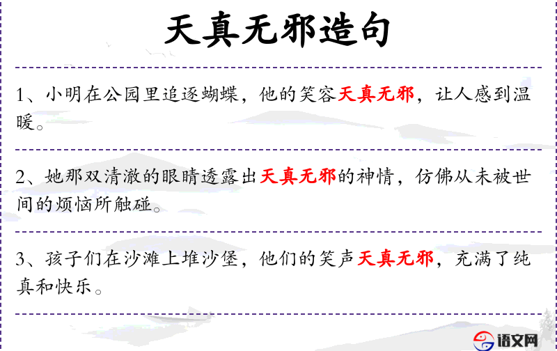 - 天真无邪:形容词短语,描述纯真和不带恶意的状态。