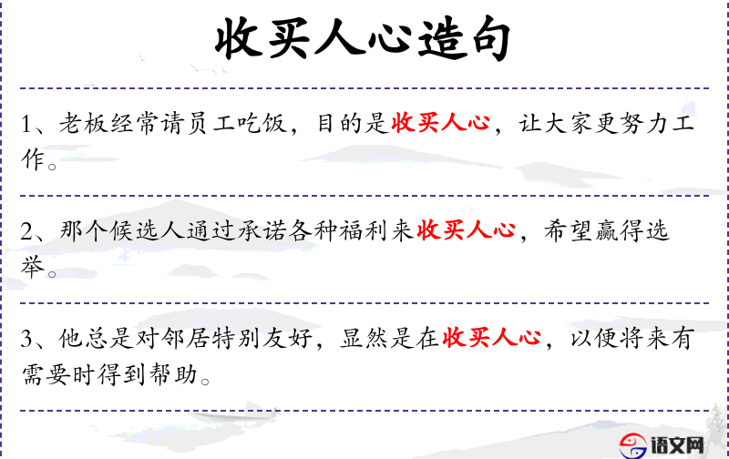 - 收买人心:这个表达在**文化中常见,意味着通过给予好处来赢得他人的好感或支持。