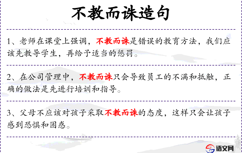 1. 【不教而诛】 教:教育;诛:处罚,杀死。不警告就处死。指事先不教育人,一犯错误就加以惩罚。