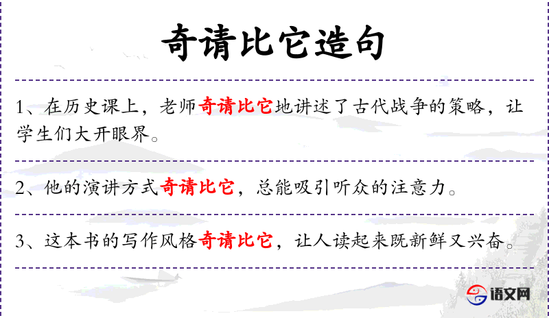 - 奇请比它地:这个短语可能存在书写错误,应为“奇特地”或“特别地”,表示以一种独特或特别的方式。