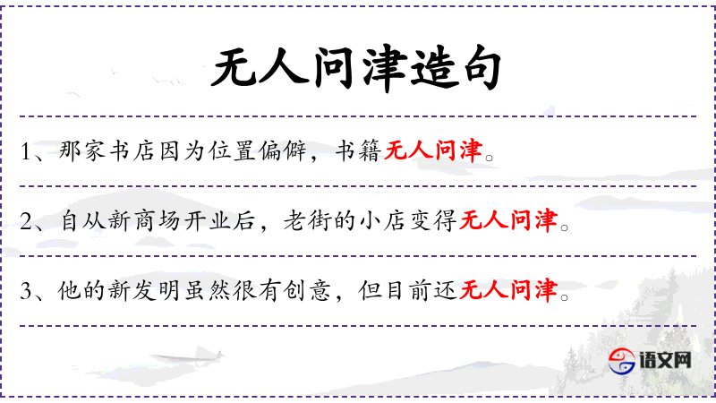 1. 【无人问津】 问津:询问渡口。比喻没有人来探问、尝试或购买。