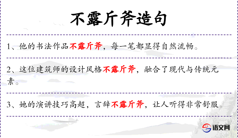 1. 【不露斤斧】 - 斤:斧头。看不见刀斧加工的痕迹。形容精巧自然。