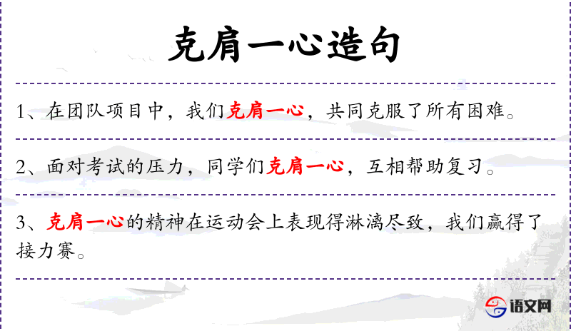 - 成语:“克肩一心”体现了团队合作的重要性。