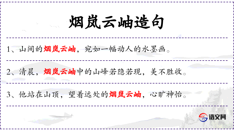 2. 【烟岚云岫】 - 岚:雾气;岫:峰峦。形容山峦之间云雾之气弥漫缭绕。