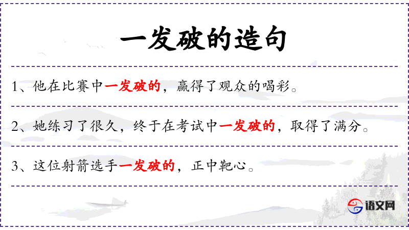 1. 【一发破的】 - 发:射出;的:箭靶的中心。一箭就射中箭靶中心。比喻一下子就击中目标或一句话就击中要害。