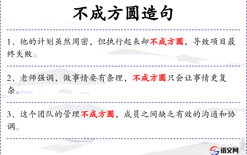 1. 【不成方圆】 方圆:借指规矩。形容言语行动没有规矩,不成样子。