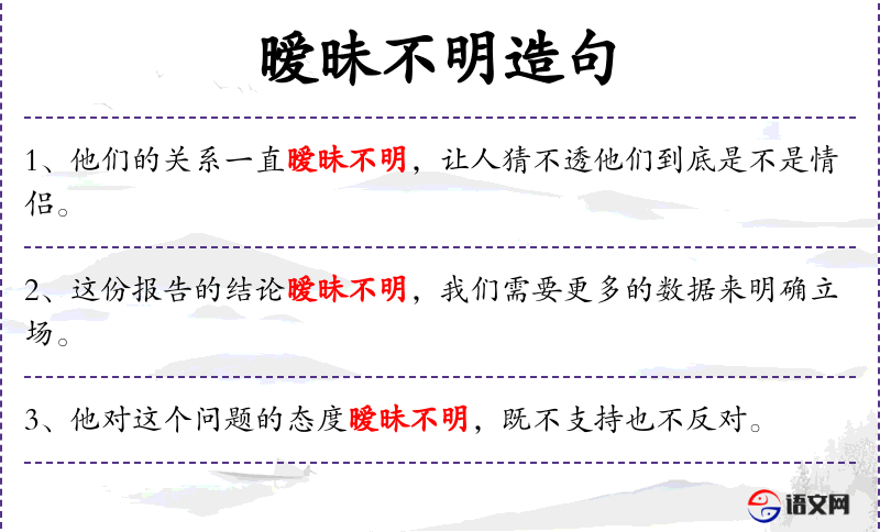 1. 【暧昧不明】 - 暧昧:含糊,不清楚。指不清不楚,不明不白。形容态度不明朗,关系不鲜明。