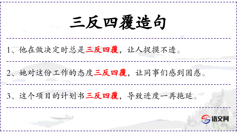 “三反四覆”是一个汉语成语,源自古代文化,用来形容人的行为反复无常。了解这个成语的背景有助于更好地理解句子的文化内涵。