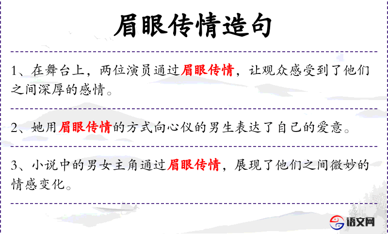 3. 【眉眼传情】 用眼色传递情意。多用于男女之间。