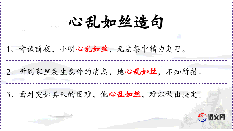 - 心乱如丝:形容心情非常混乱,同义表达有“心烦意乱”、“心神不宁”等。