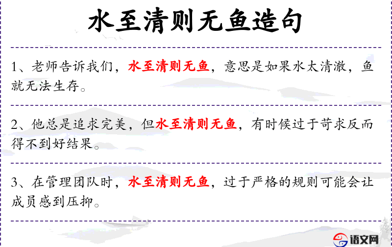 4. 【水至清则无鱼】 - 水太清,鱼就存不住身,对人要求太苛刻,就没有人能当他的伙伴。比喻过分计较人的小缺点,就不能团结人。