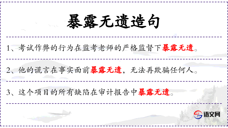 1. 【暴露无遗】 - 暴露:显露,显现;遗:遗漏。全都暴露出来。