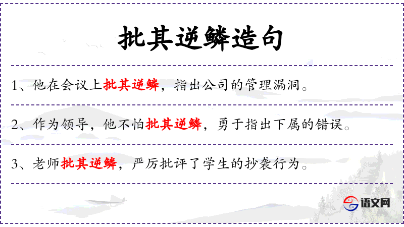 - 批其逆鳞:这个成语源自**古代,龙有逆鳞,触之则怒。比喻触碰别人的忌讳或敏感点。