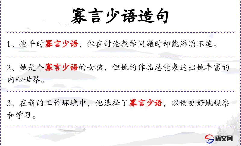 - 寡言少语:形容词短语,表示说话不多,沉默寡言。