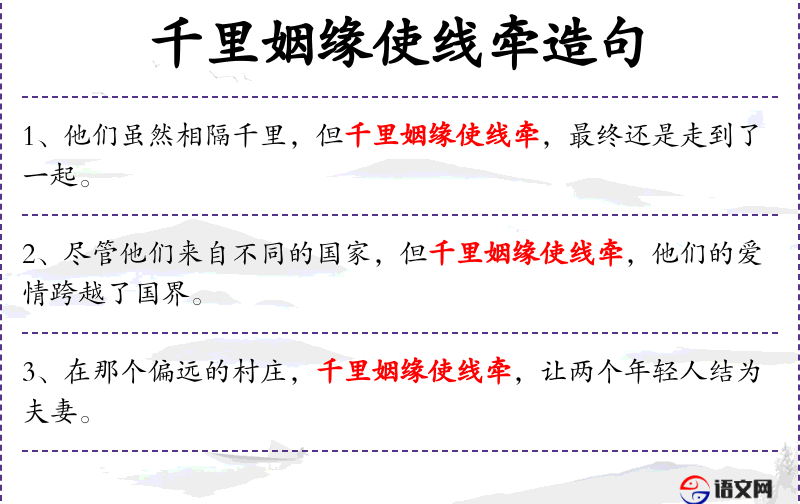 - 千里姻缘使线牵:成语,意为即使相隔很远,缘分也会将两人联系在一起。
