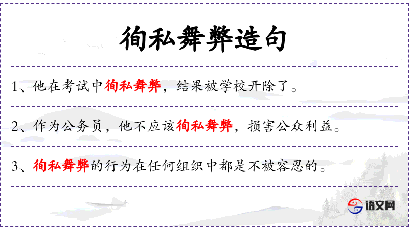- “徇私舞弊”是一个成语,强调了公正无私的重要性。