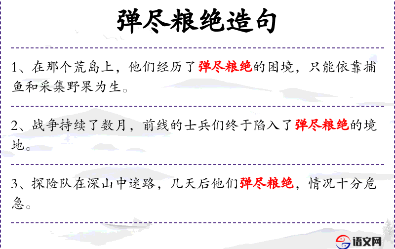 - 相关成语:“弹尽粮绝”是一个常用的成语,用来形容在困境中物资耗尽。