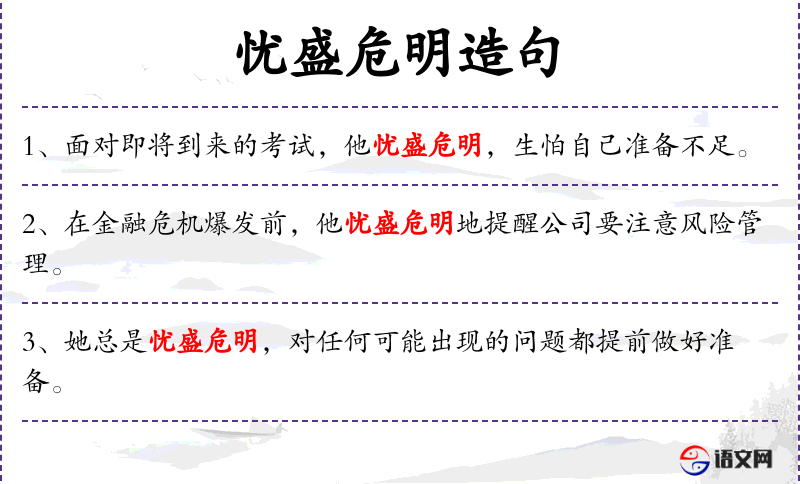 - 忧盛危明:形容词,意为“忧虑盛行,危险明显”,强调对潜在危险的深刻认识和担忧。