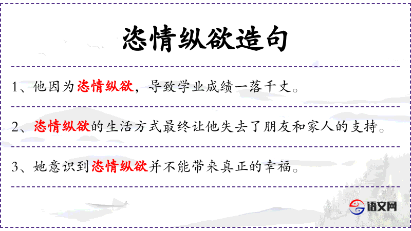 - 恣情纵欲:形容词短语,描述行为放纵、不受约束。