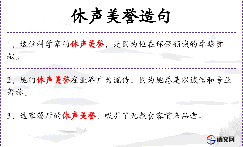 - 主语:他的休声美誉