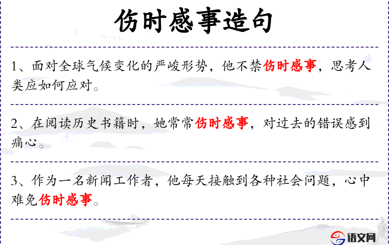- 伤时感事:形容词短语,指对时代变迁或**的深刻感受和悲伤。