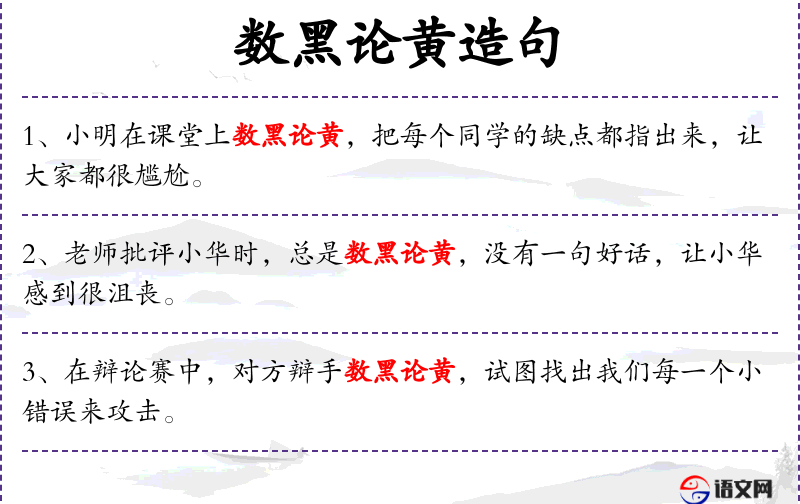 - 数黑论黄:成语,形容过分挑剔,吹毛求疵。