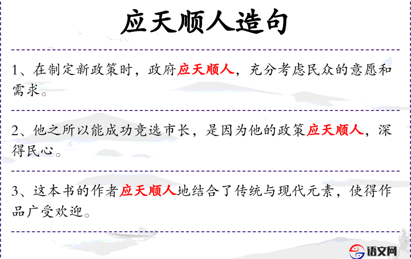 句子:“[这本书的作者应天顺人地结合了传统与现代元素,使得作品广受欢迎。]”