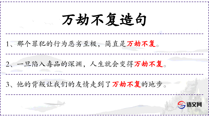 - 德文:使用了“nicht wieder gutzumachende Situation”来表达“万劫不复”的含义。