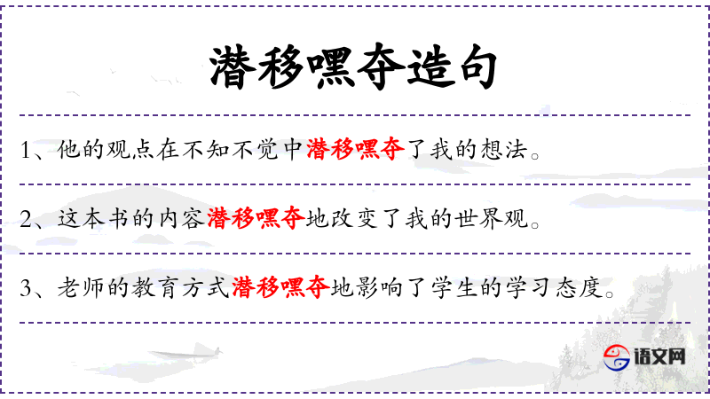 2. 【潜移嘿夺】 - 指不露形迹地改变或取得。同“潜移默夺”。