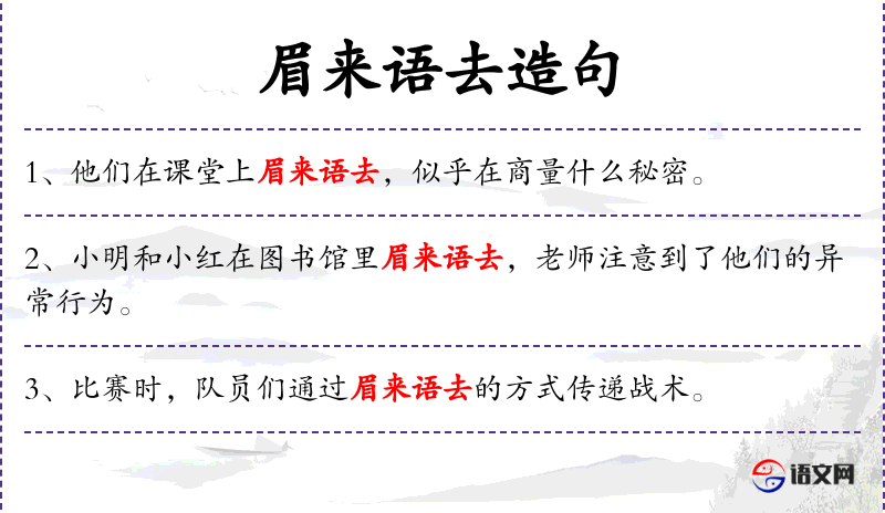 4. 【眉来语去】 - 眉目传情,话语示意。多形容男女之间的传情达意。