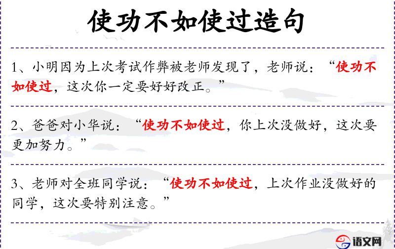 - 宾语:“使功不如使过,你上次没做好,这次要更加努力。”